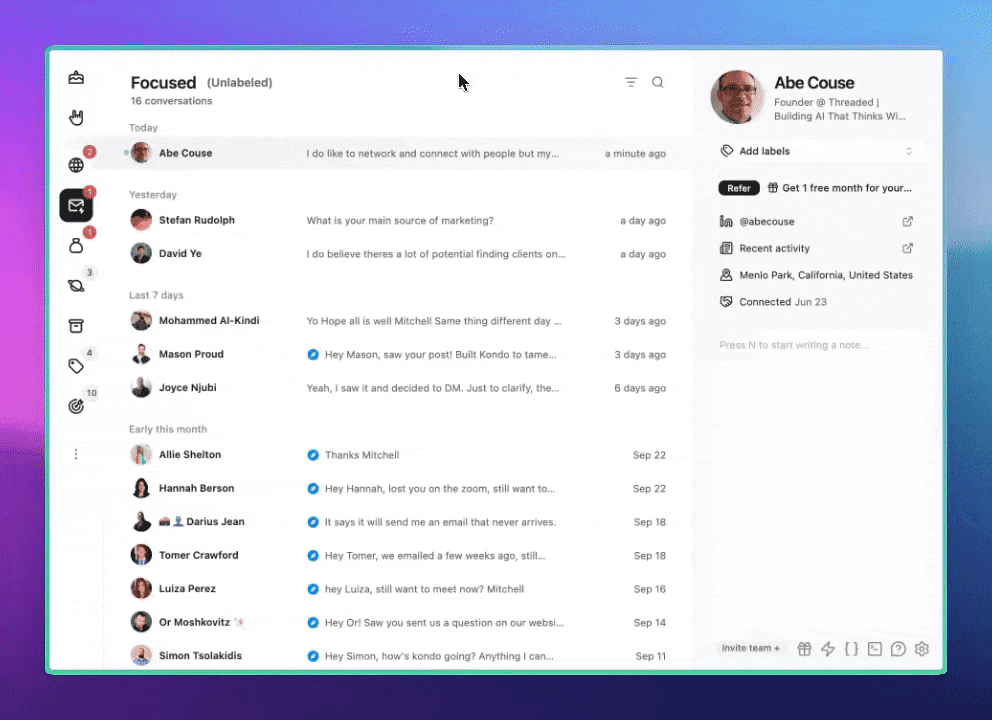 Merging your inboxes is just the first step. Once your messages are centralized, you can apply Kondo’s productivity suite to manage your Sales Navigator leads with the same speed as your regular network.