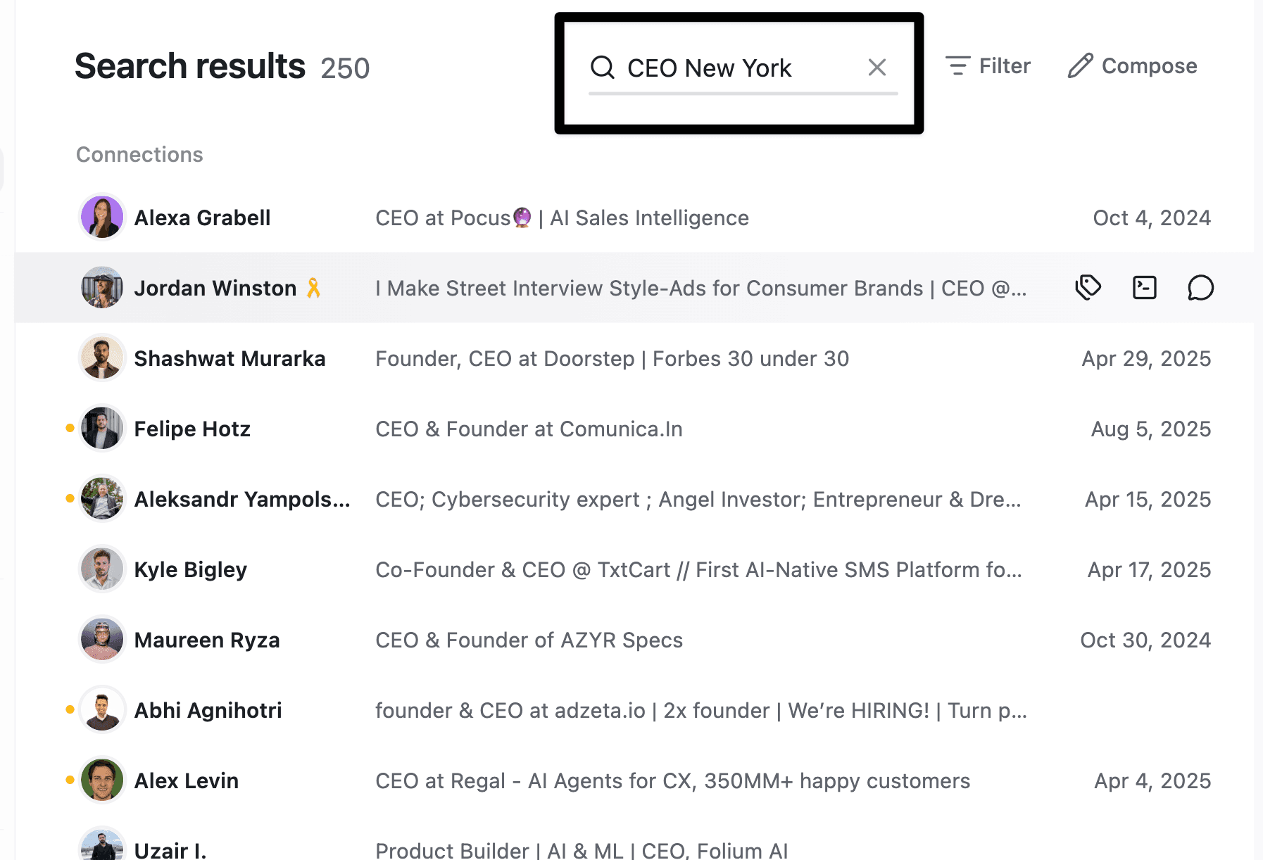 Search your entire network by any keyword and see every matching connection instantly.